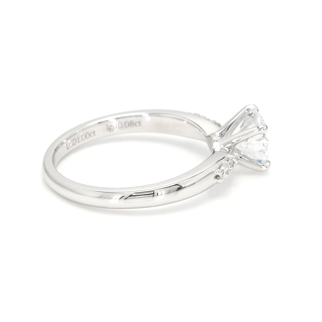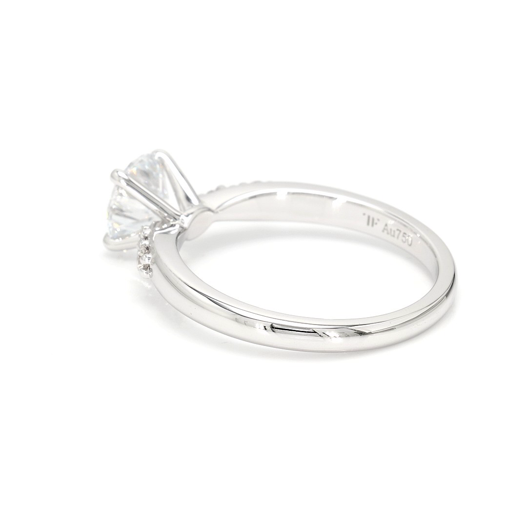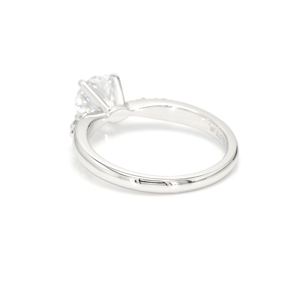 This Round -shaped lab-grown diamond ring shines with 1 carat, an E color, and VS1 clarity. Set in white gold, available in size 6.5.