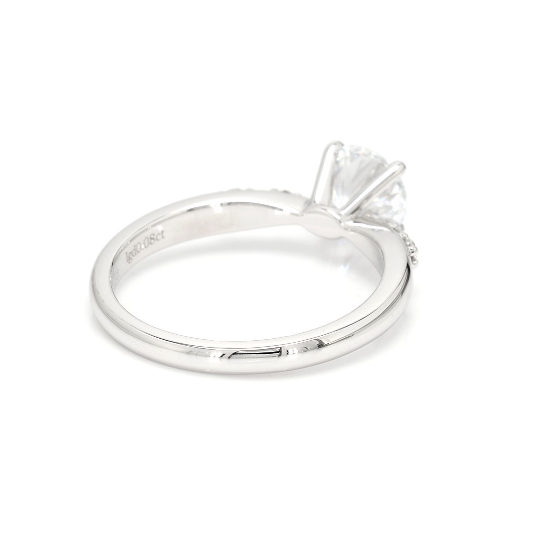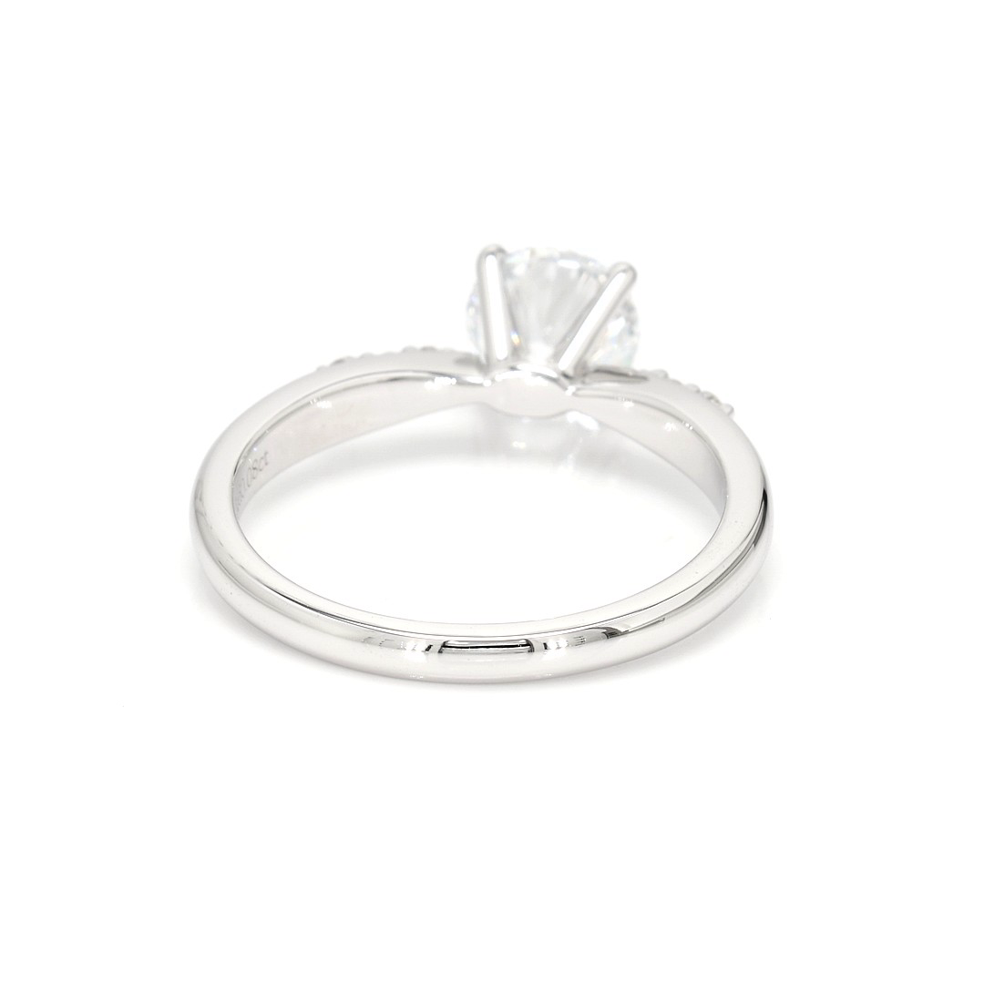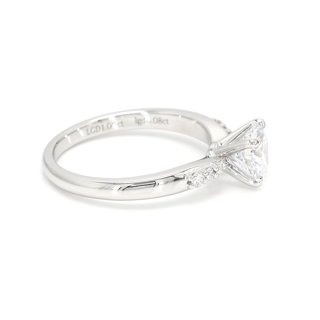 This Round -shaped lab-grown diamond ring shines with 1 carat, an E color, and VS1 clarity. Set in white gold, available in size 6.5.